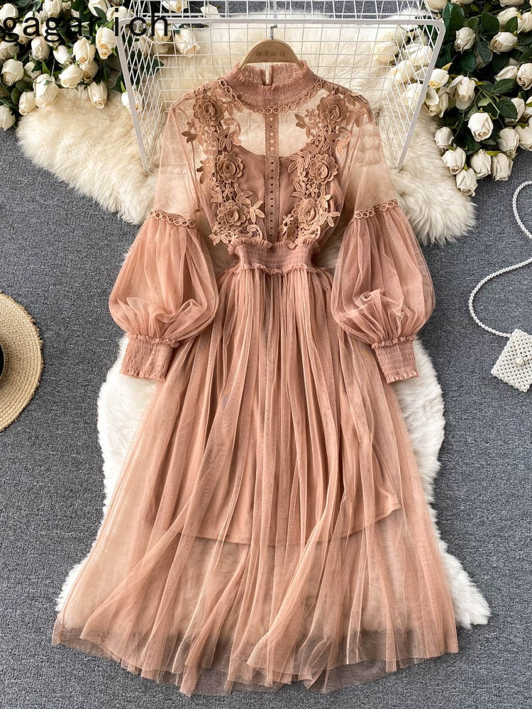 Women's Mesh Dress Stand Collar Lantern Sleeve High Waist