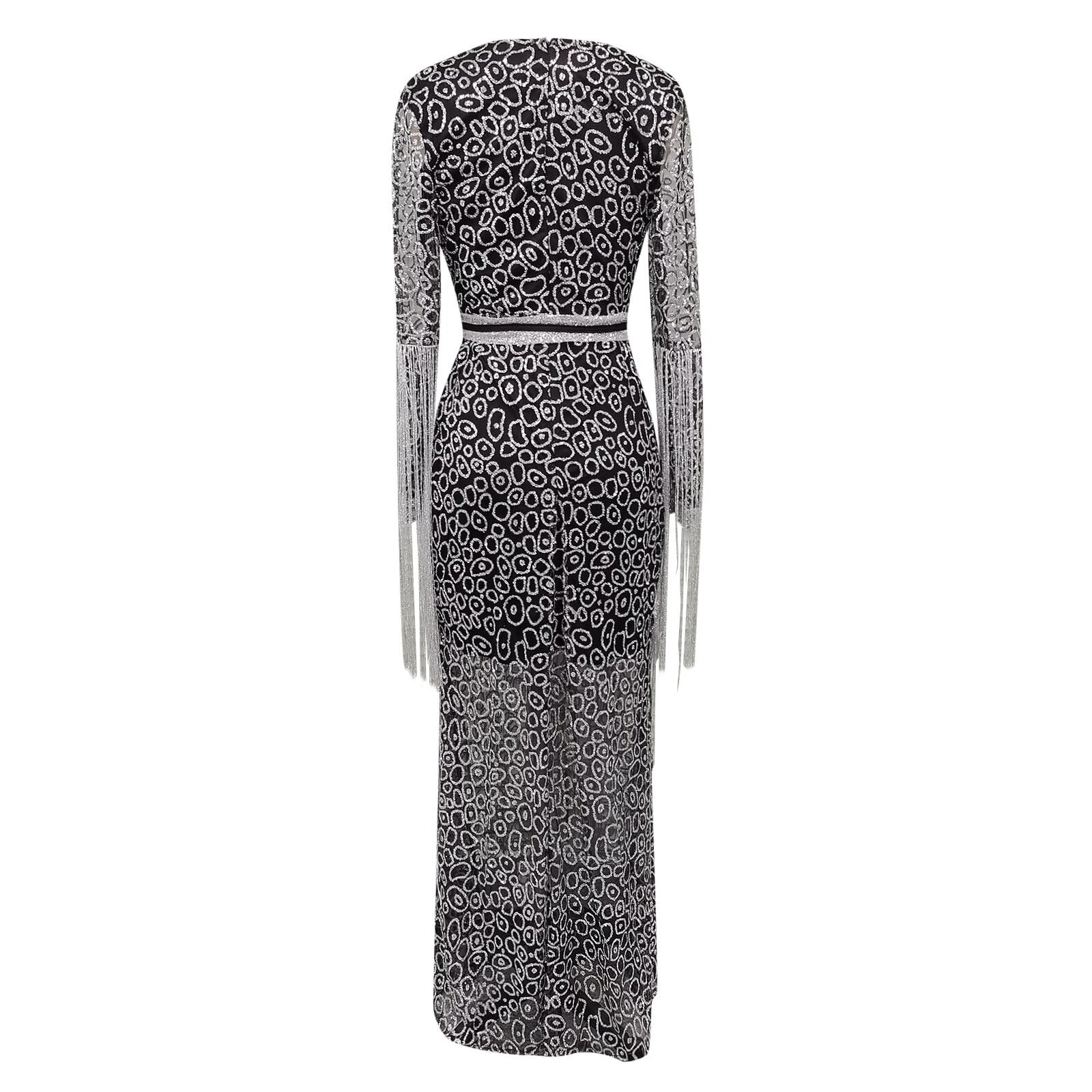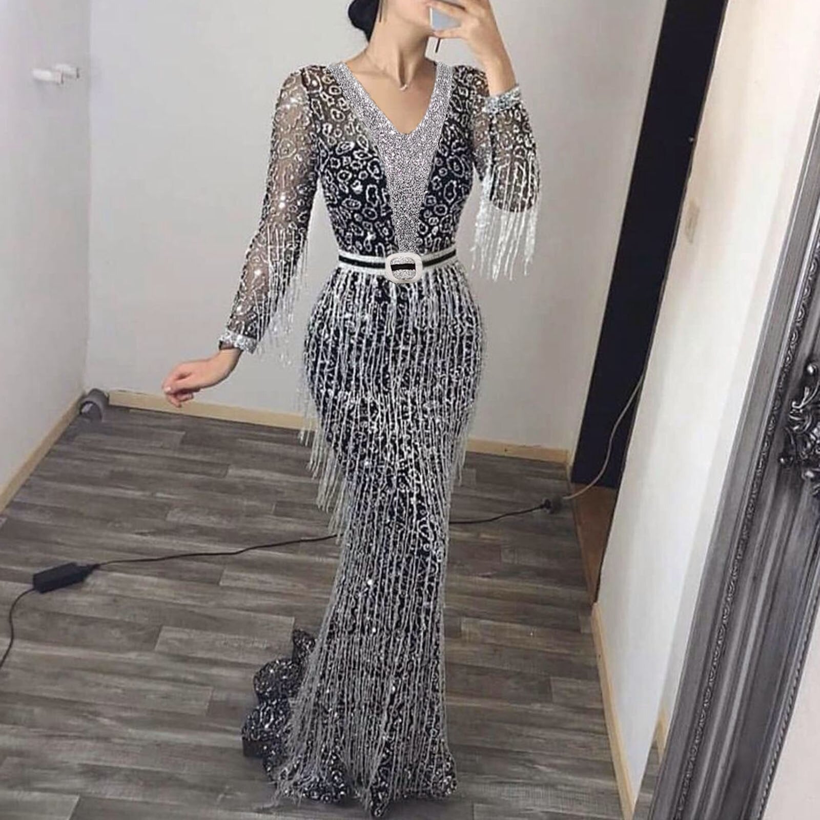 New Elegant Silver Maxi Party DresseLong Sleeve Sexy Lace V Neck Long Dresses Sequins