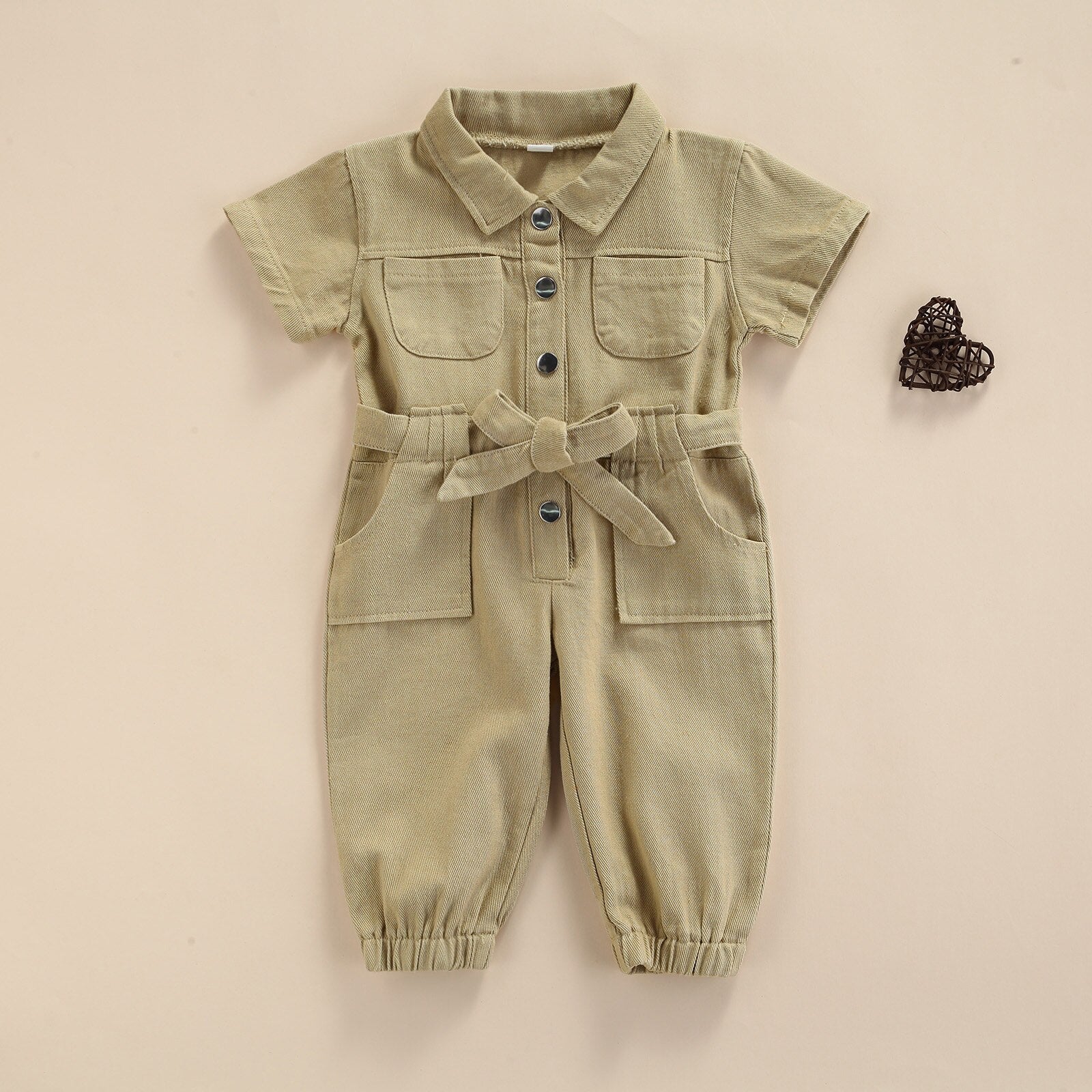 Toddler Baby Girl’s Casual Long Sleeve Jumpsuit Fashion Solid Lapel Pocket Single-breasted Pants
