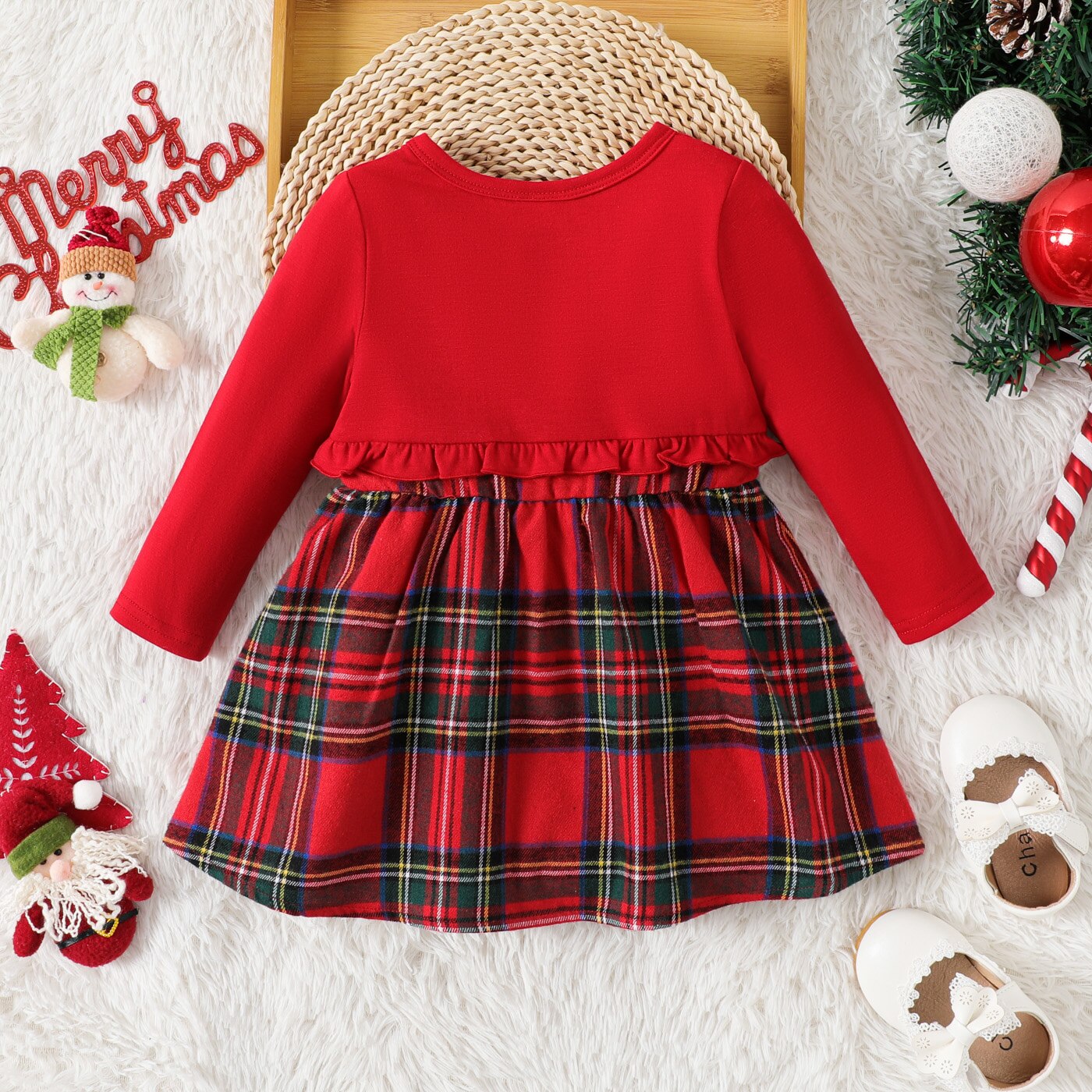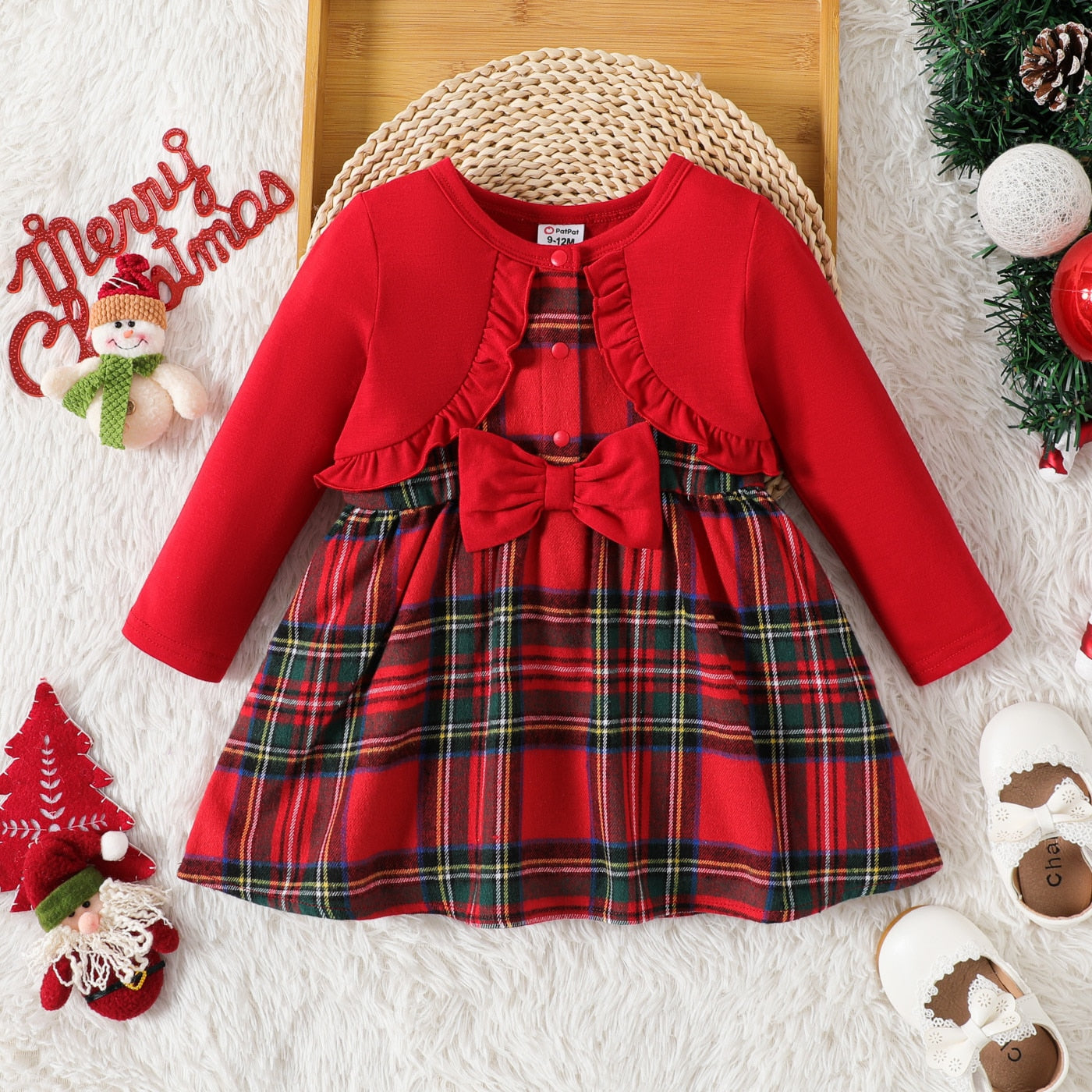 Christmas Dresses Baby Girl Clothes Red Faux-two Long-sleeve Ruffle Trim Bow Front Plaid Dress