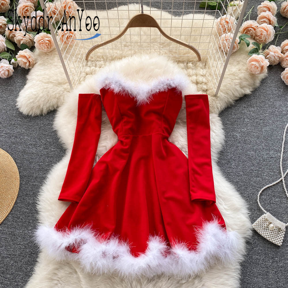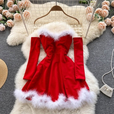 Women Elegant Dress For New Year Strapless Backless Furry Sexy Short Mini Christmas Dress