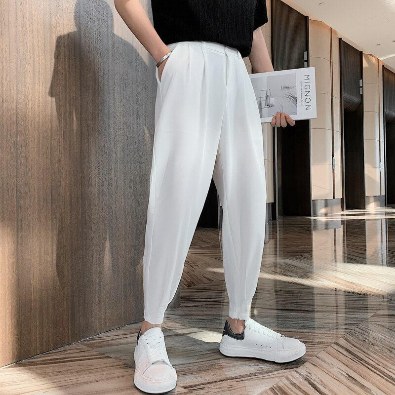 Autumn Men Solid Ankle-Length Tapered Trousers White Khaki Black