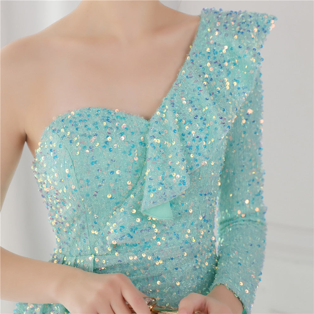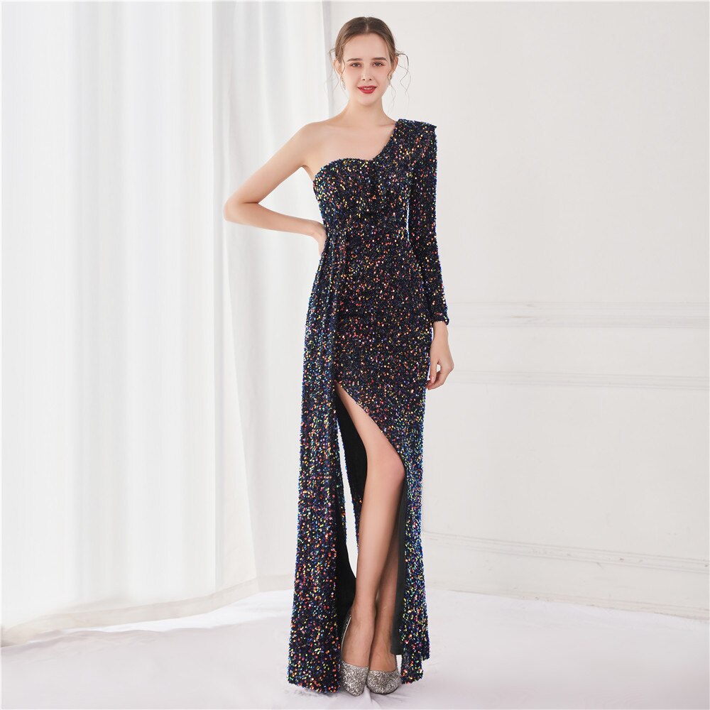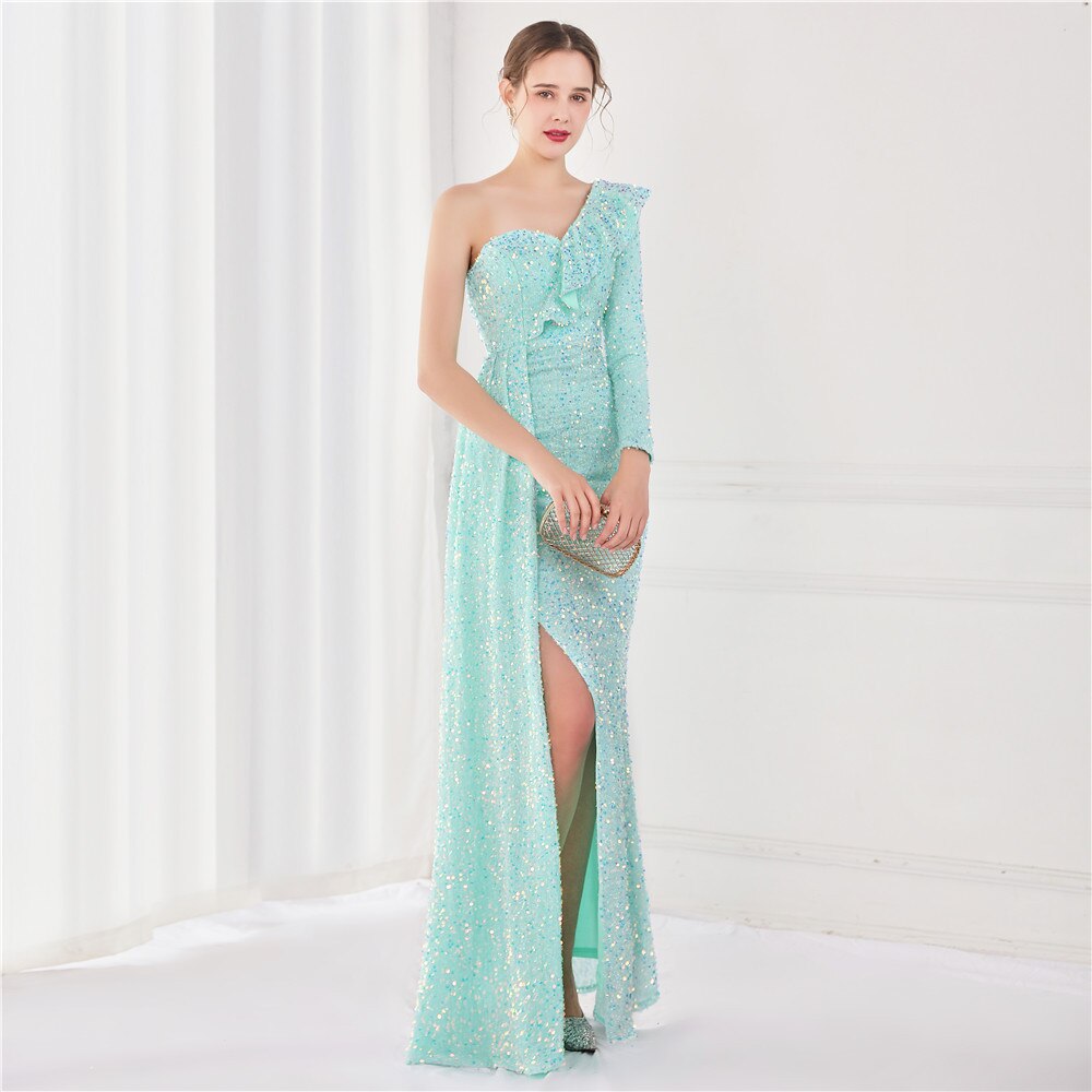 Dress Women Sequins Party Sexy One Shoulder Ruffles Evening Maxi Side Long Blue Dress