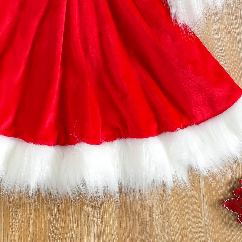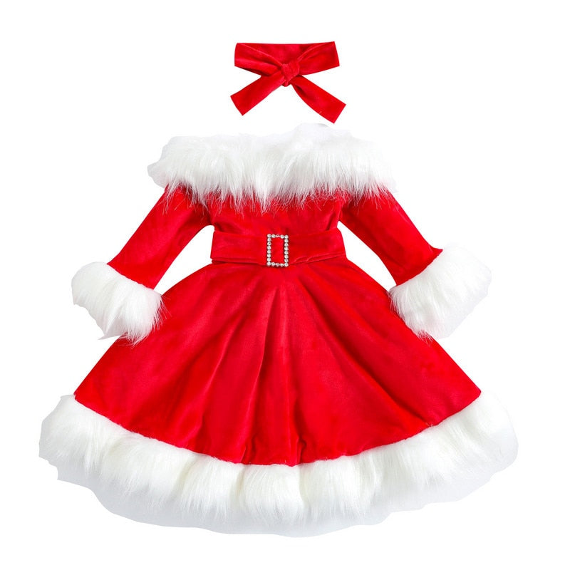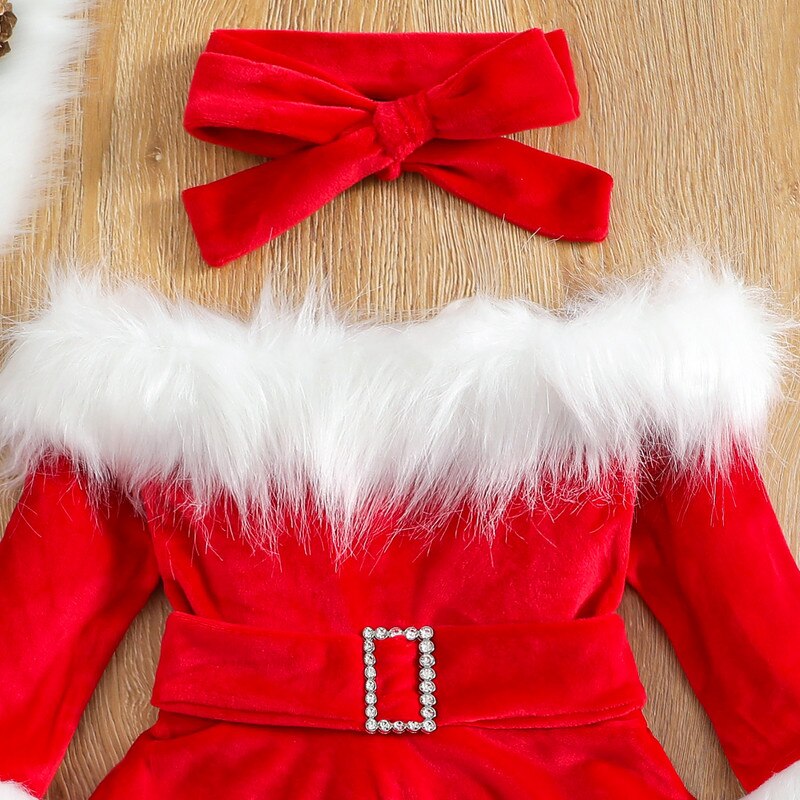Christmas Dress Kid Baby Girl Clothes Faux Fur Patchwork Long Sleeve Off Shoulder A-Line Dress with Belt Bow Headband