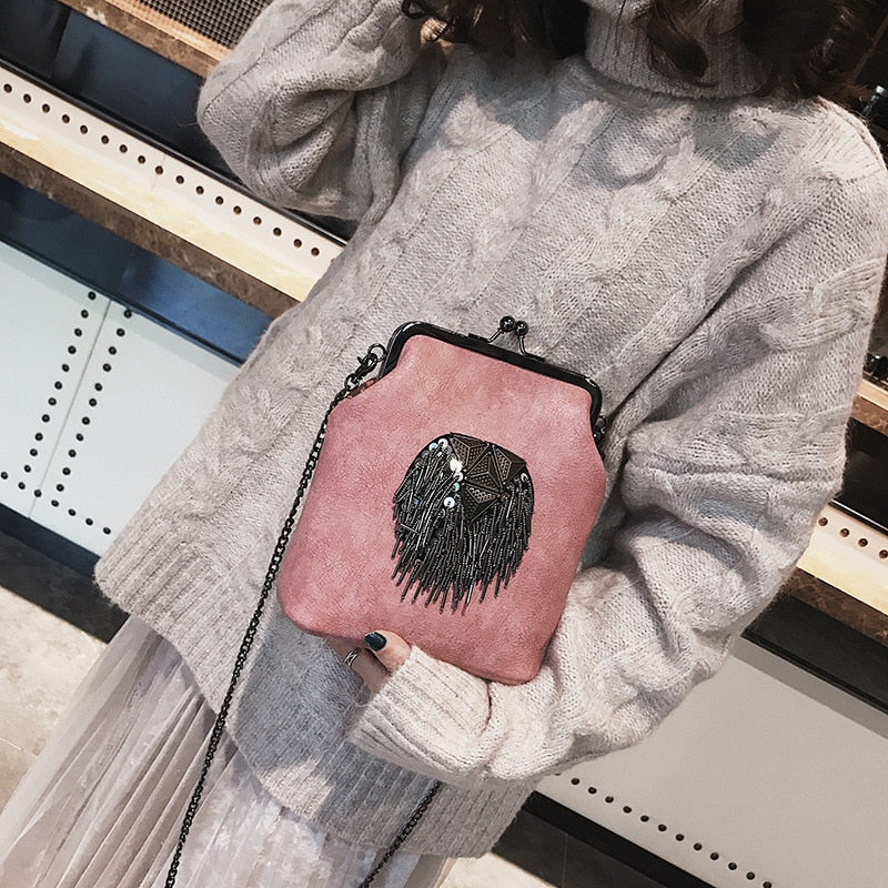 Новые винтажные модные сумки через плечо с бахромой и заклепками и кисточками, сумки через плечо с цепочкой для женщин, девушек, леди, поцелуй, замок, сумки из искусственной кожи, кошельки, сумка